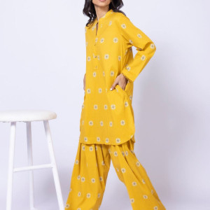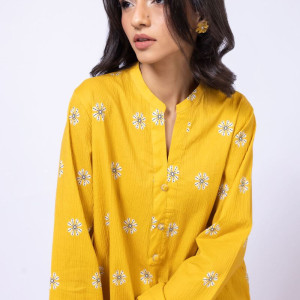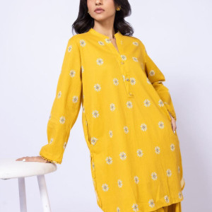Kurta Fit: Regular Fabric Composition: 97% Cotton | 3% Elastane Material: Cotton Crinkle Description: A printed kurta featuring full sleeves, a band collar with a V-cut, buttons on the front and a rounded hem. Pants Fit: Relaxed Fabric Composition: 97% Cotton | 3% Elastane Material: Cotton Crinkle Description: Printed pants featuring a flared cut.